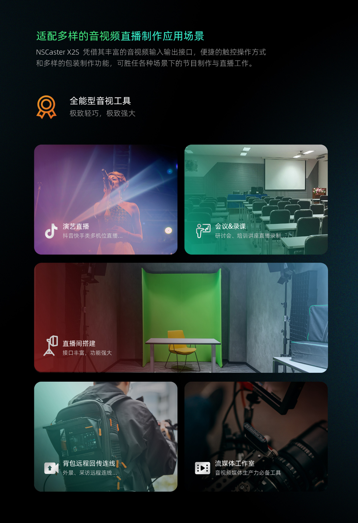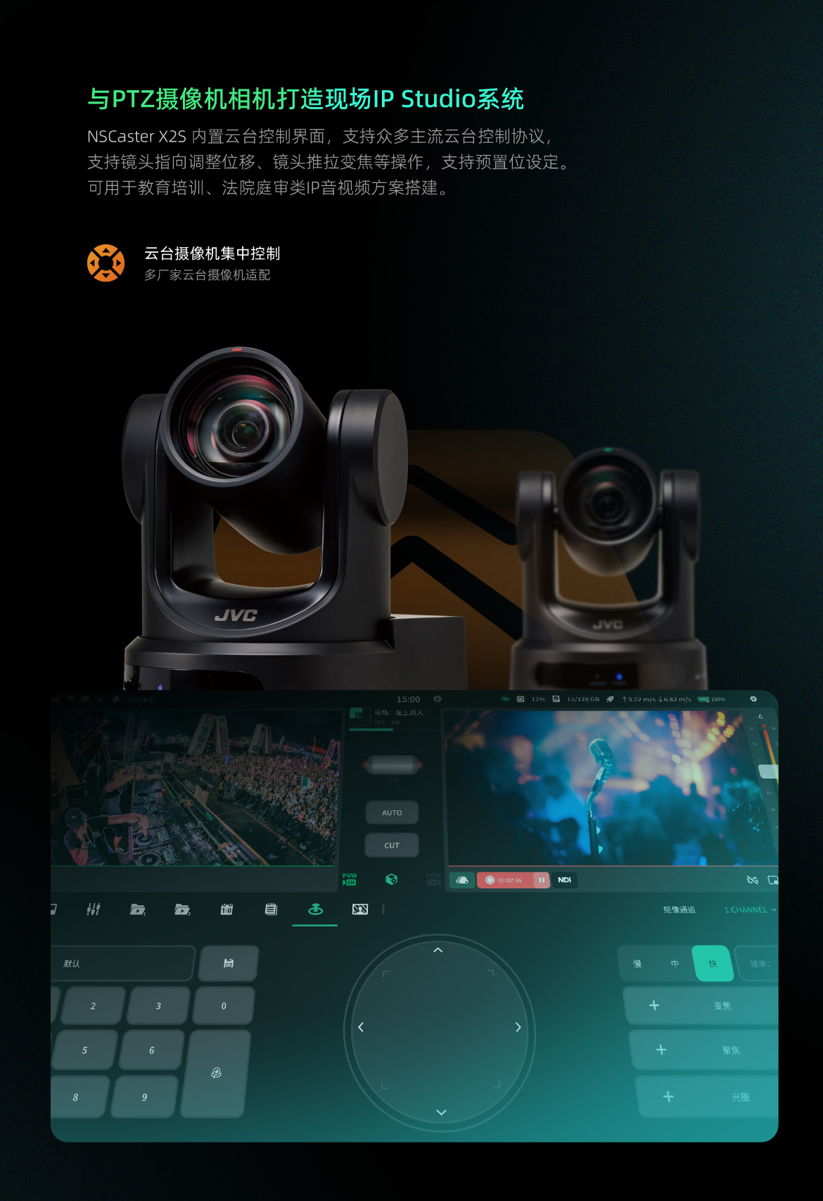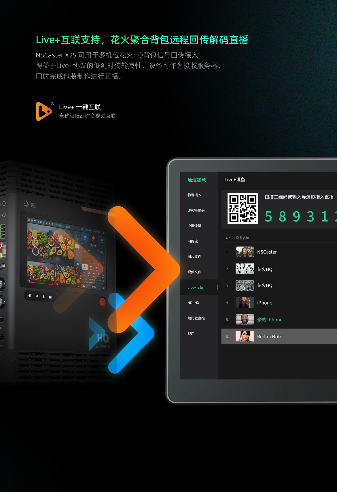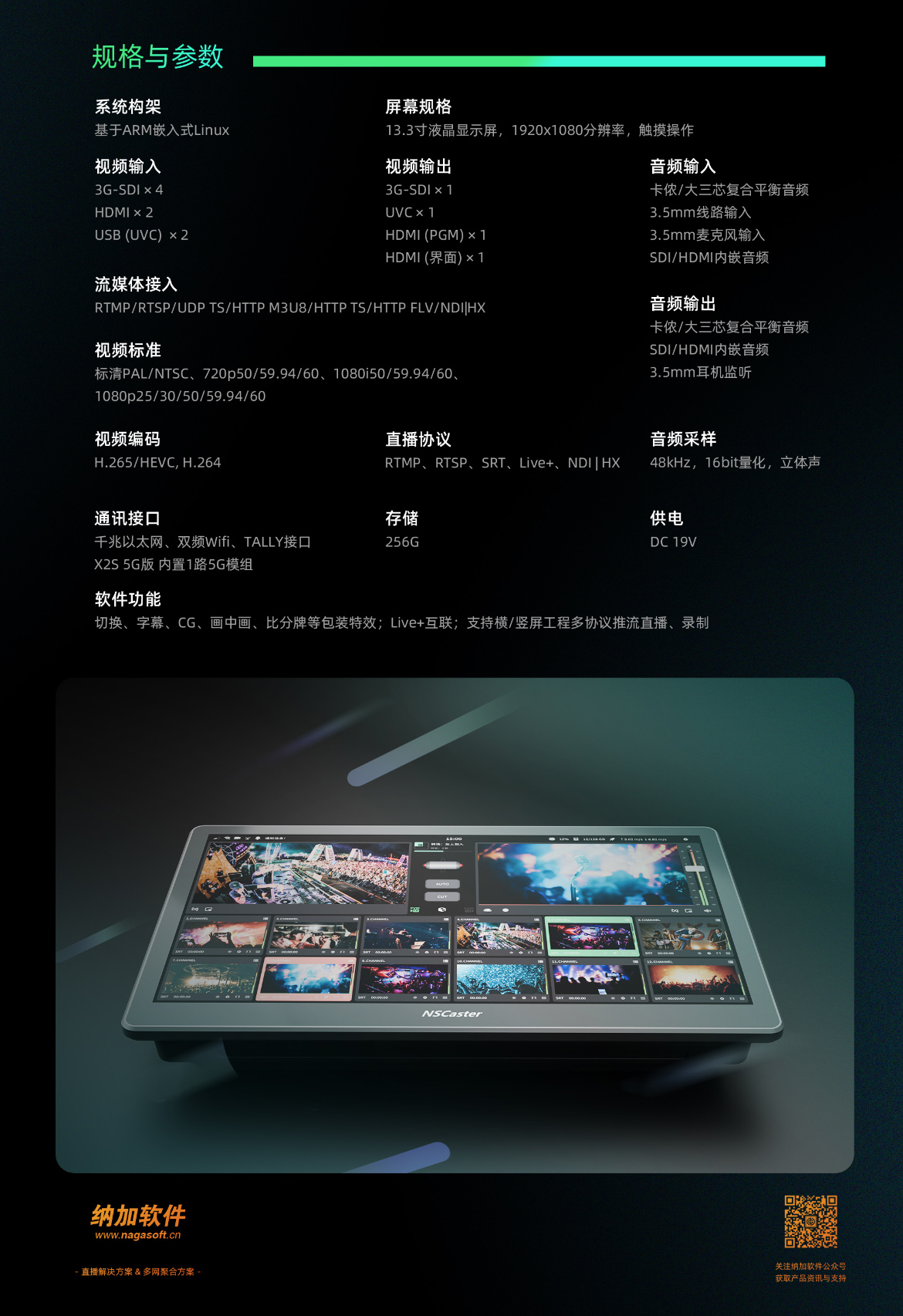 NSCaster X2S 是一款嵌入式的12路导播平板,支持全高清制式节目制作并推流录制。设备配备13.3英寸FHD触控显示屏,支持SDI×4 + HDMI×2物理接口1080p60信号输入;支持众多主流格式流信号加载接入和LIVE+协议花火HQ聚合编解码器、纳加手机拍客APP等设备互动接入。