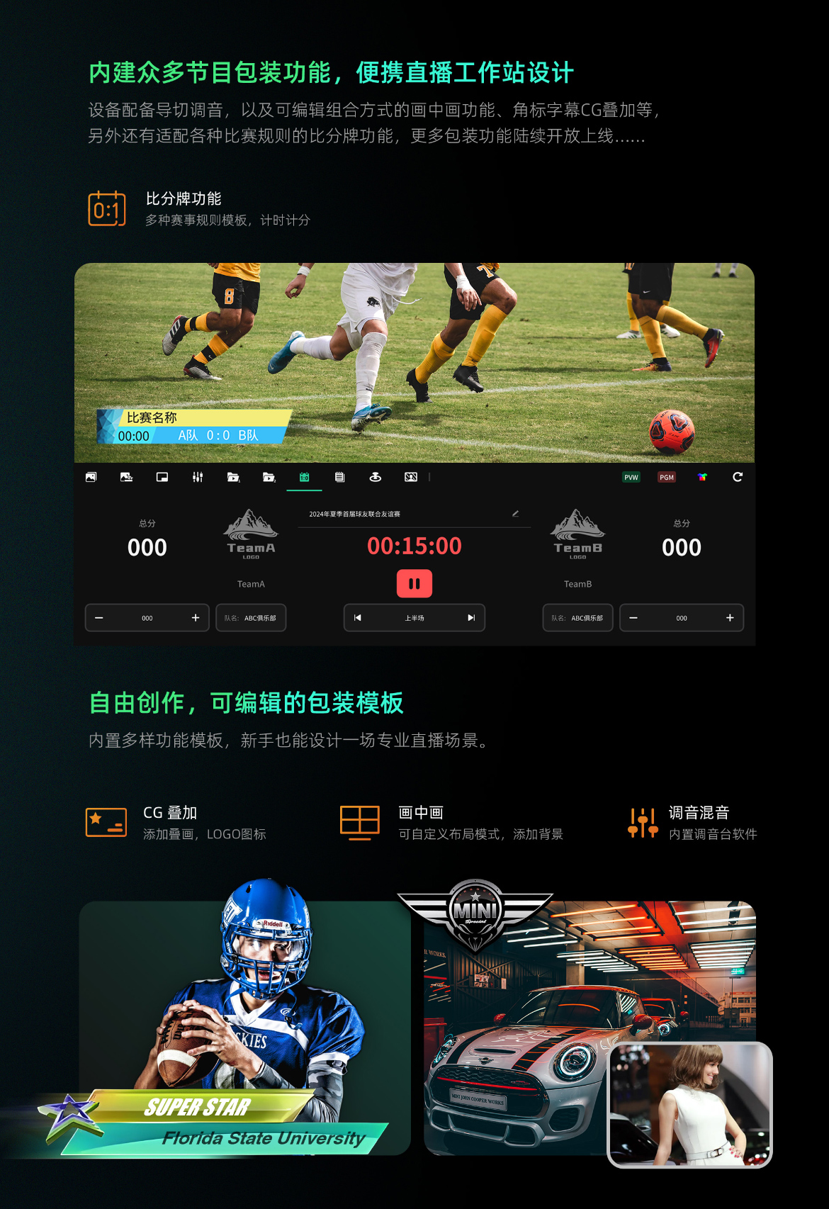 针对体育赛事类直播,NSCaster X2S内置多种赛事模板的记分牌,并且适配赛事规则,让赛事直播更专业,观看更直观。