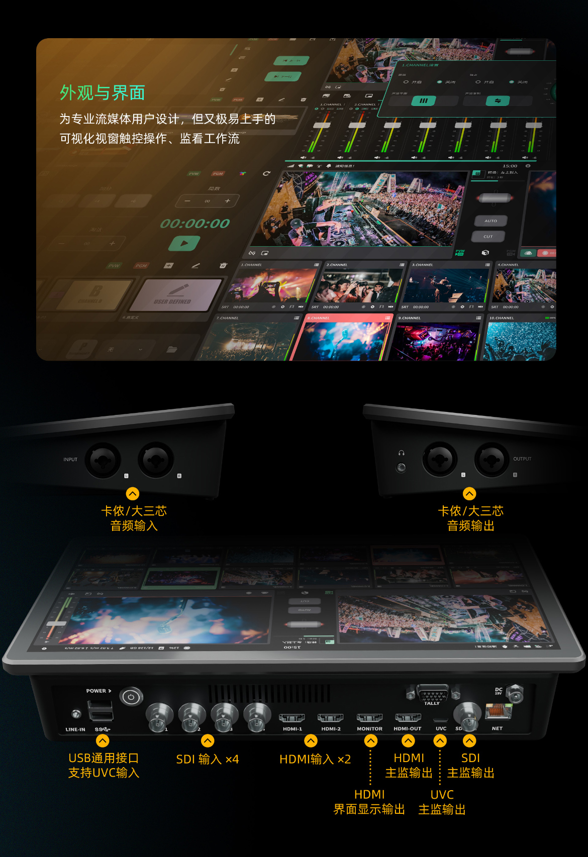 NSCaster X2S 支持UVC协议的TYPE-C接口输出,可将导播制作信号接入笔记本电脑,用于各种直播助手类软件端开播。