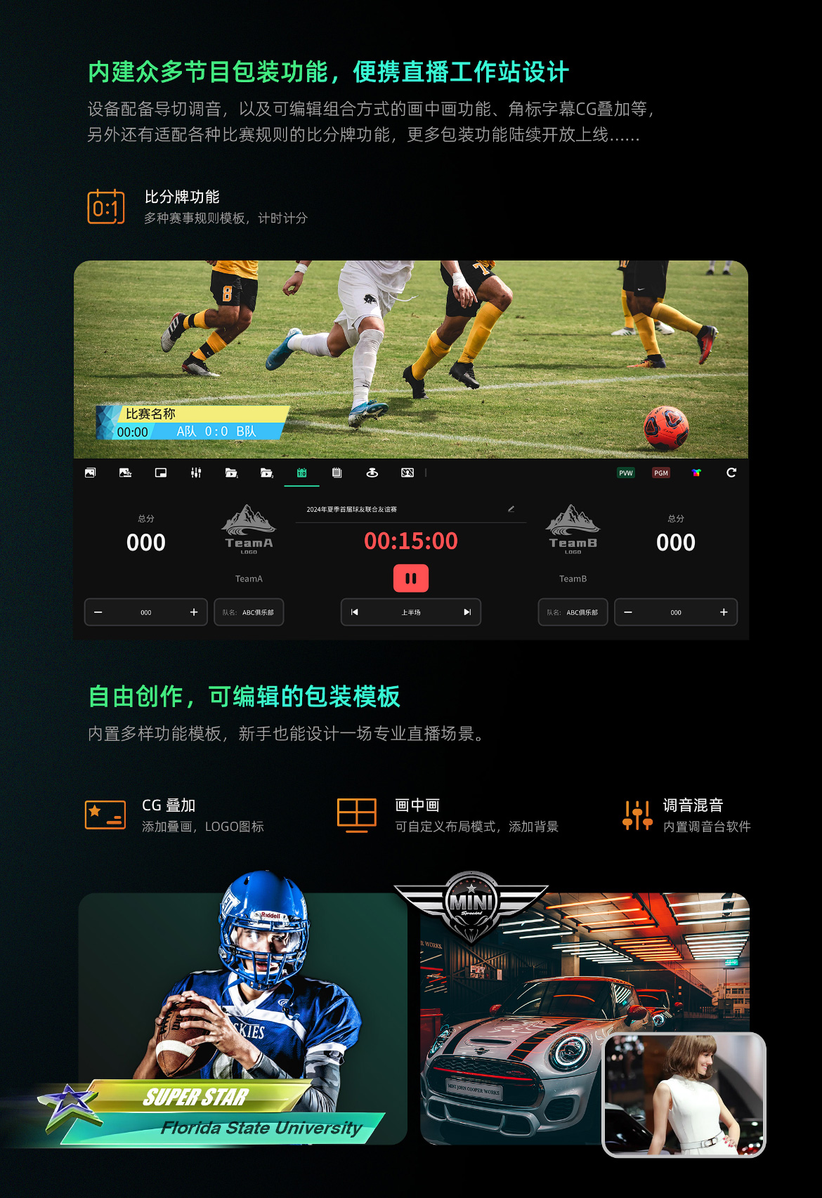 针对体育赛事类直播,设备内置多种赛事模板的记分牌,并且适配赛事规则,让赛事直播更专业,观看更直观。