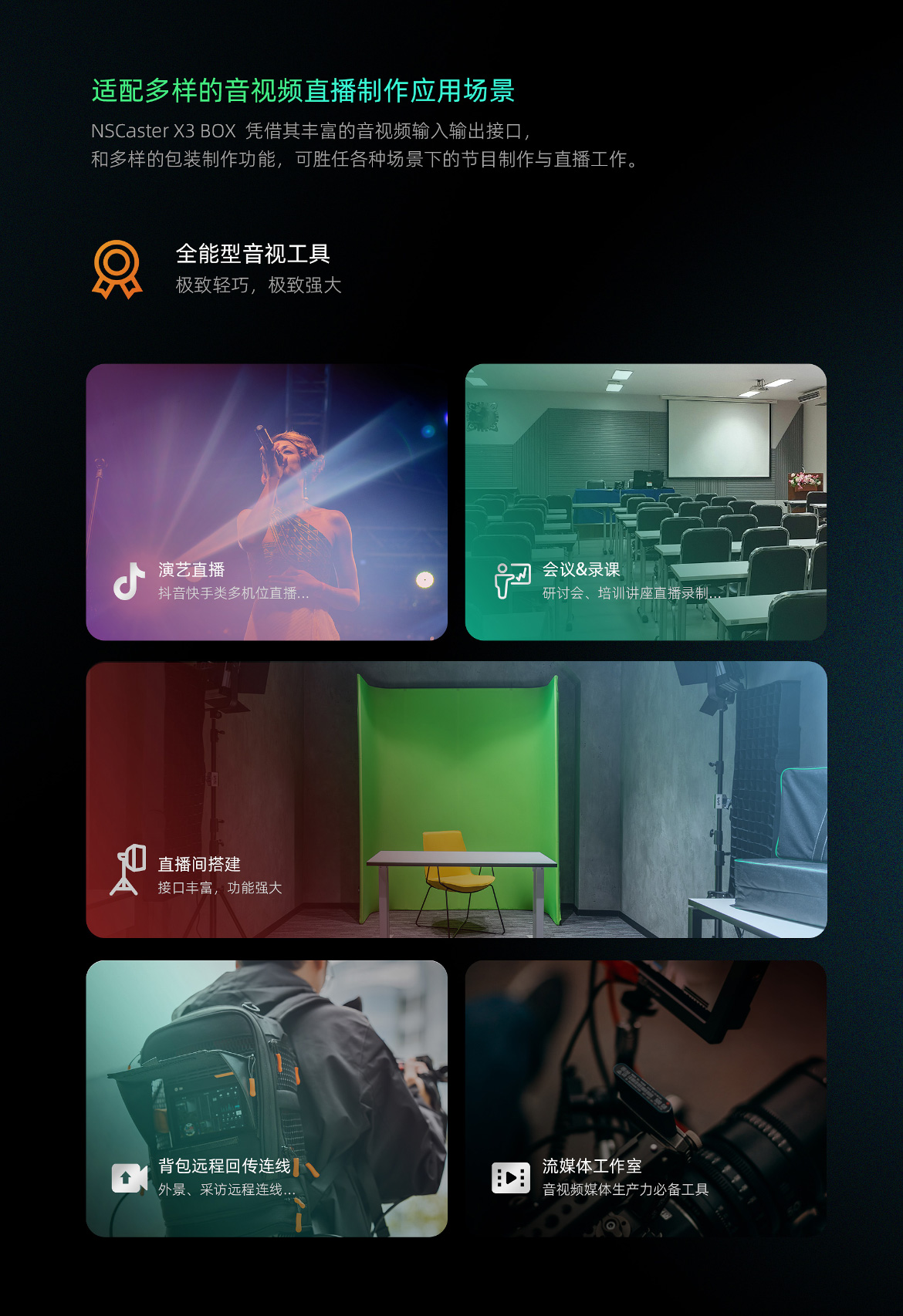 NSCaster X3 BOX 是一款嵌入式的12路直播工具,支持全高清制式节目制作并推流录制。设备支持SDI×4 + HDMI×2物理接口1080p60信号输入;支持众多主流格式流信号加载接入和LIVE+协议花火HQ聚合编解码器、纳加手机拍客APP等设备互动接入。